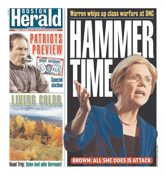 If you picked “hammer” for your DNC drinking game last night, you were knee-walking ten minutes into Elizabeth Warren’s primetime speech, which got very different play in this AM’s local dailies.