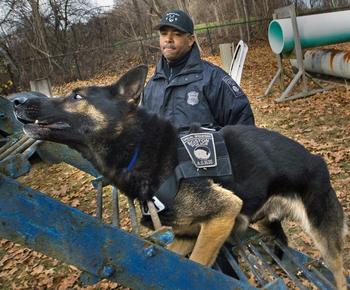 Boston,MA-12/12/12- Boston police officer Troy Caisey, head dog trainer at the department, works with his dog Branson at the Allandale Rd. BPD dog training facility. Staff photo by Mark Garfinkel