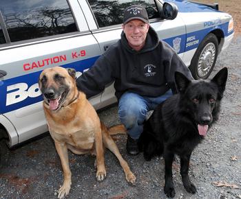 Woburn, MA – 12/12/12 – Boston Police Officer Joseph Fisher plays with his retired police dog, Tiburon, and his current police dog, Nitro, Wednesday, December 12, 2012. Staff photo by Angela Rowlings.