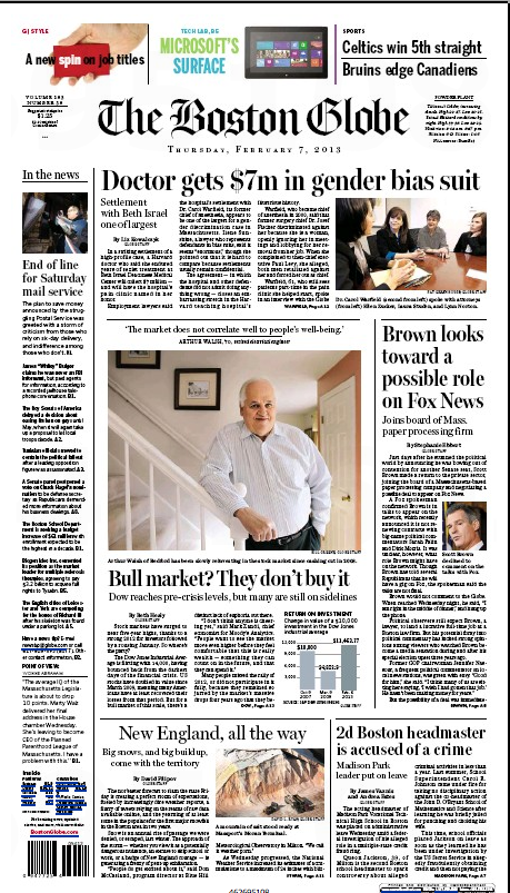 Another crisscross in the local dailies as former Sen. Scott Brown (R-$$$) mulls over joining the madcap crew at Fox News. The Boston Globe front-pages it,; the Boston Herald relegates it to page 12.