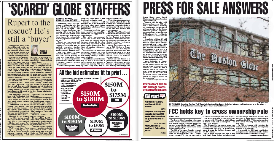 “Rupert would be terrifically interested in the Boston Globe,” said Vanity Fair contributing editor Michael Wolff, author of “The Man Who Owns the News: Inside the Secret World of Rupert Murdoch.” “Rupert is now in the process of shopping for American newspapers but doing that in the context of that this is the bottom of the market.”