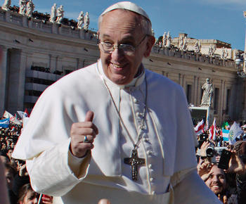 These thousands watched on at least a dozen Jumbotrons as Pope Francis, just before his inaugural Mass, rode about the square not in the bulletproof glass popemobile, but, unusually, in an open-air model. It allowed him to get on and off and kiss a baby and the forehead of a man who appeared disabled and smiled up at Francis’ face.