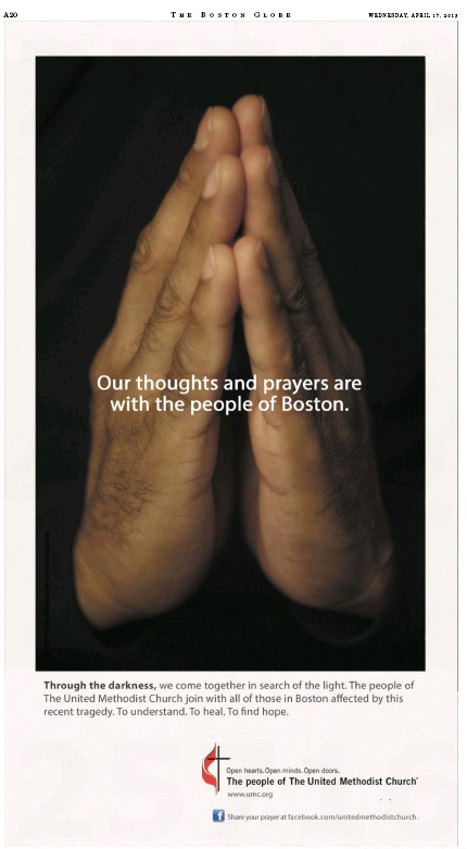 First off, both Boston dailies have acquitted themselves admirably in their coverage of the Marathon bombing, each playing to its particular strengths. And today both the Globe and the Herald feature full-page ads from sympathizers and well-wishers in the wake of Monday’s horrific events.