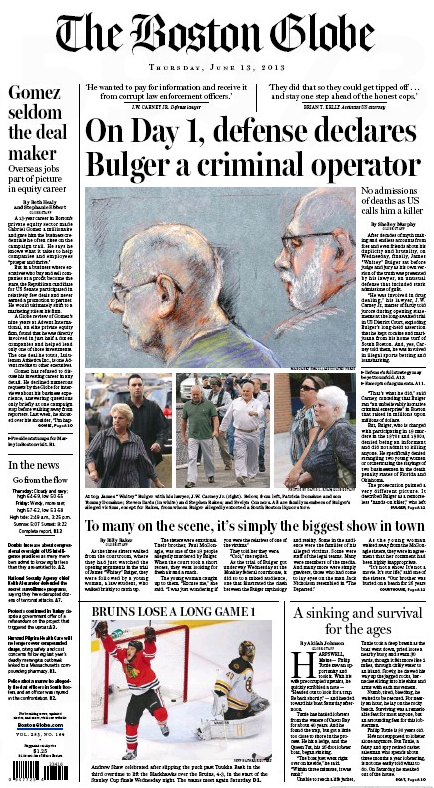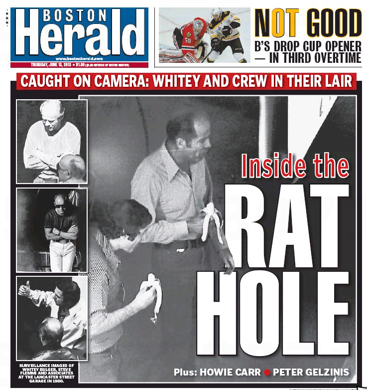 The Boston Herald goes all news noir in today’s edition, starting with its Page One “Whitey and Crew in Their Lair” collage.