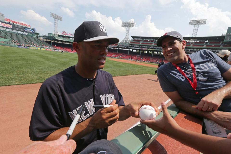His pregame visit took place in a Fenway suite where fans — young and old, some with cancer, victims of the Boston Marathon bombings — along with longtime Fenway employees sat in a semicircle around the 43-year-old Rivera, who was dressed in his Yankees batting-practice uniform.