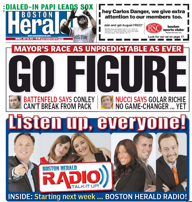 As the hardreading staff noted yesterday, the Boston Herald devoted two full pages of Monday’s edition to the gala announcement of an Internet radio stream that will debut next week. What we neglected to mention, however, was that one-half of Monday’s Page One was devoted to the glad tidings.