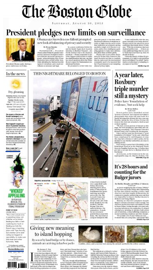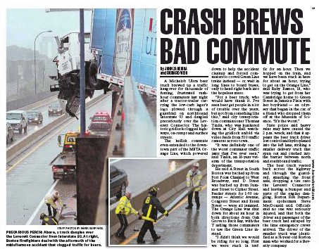 When a beer truck “plowed through a guardrail on northbound Interstate 93 and dangled precariously over the Leverett Connector” yesterday, both local dailies made it front-page news.