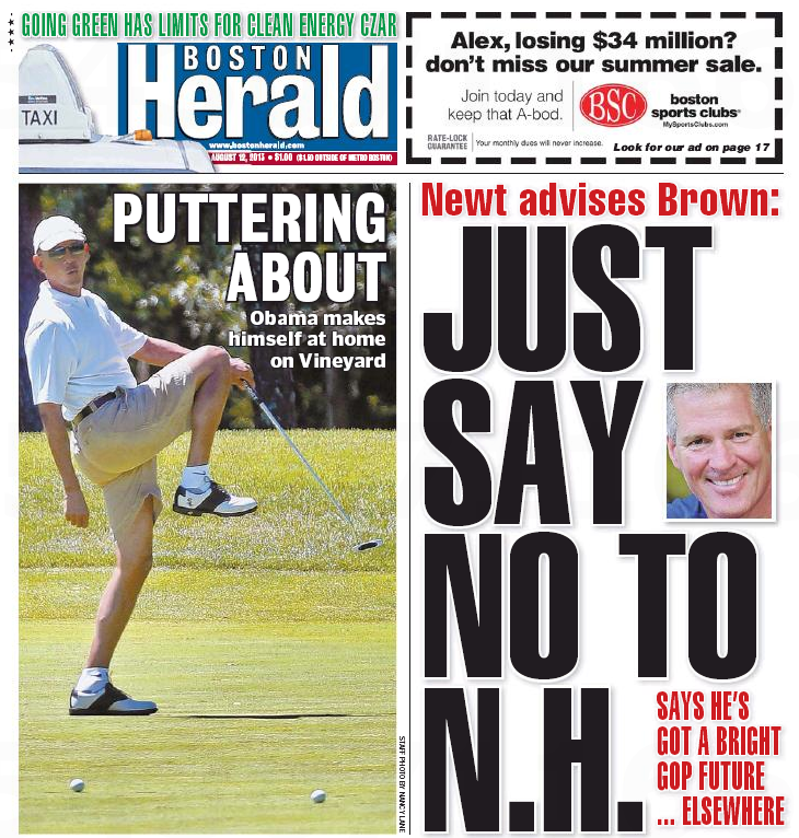 Man, is the Boston Herald grumpy today. And the object of its grumpitude is the Golfer in Chief, who gets half of Page One for starters.