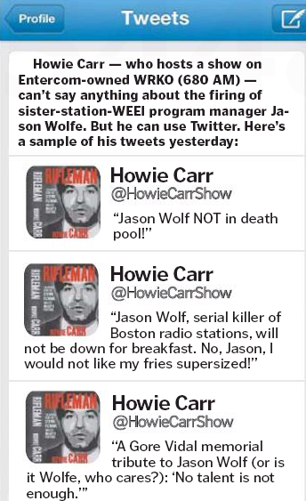 Start with the Boston Herald, which goes all Page One over the firing of longtime WEEI VP of programming/operations Jason Wolfe – except it’s really about Gerry Callahan, a WEEL morning drive personality and a sports columnist for the feisty local tabloid in his spare time.