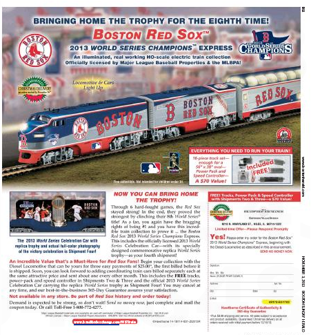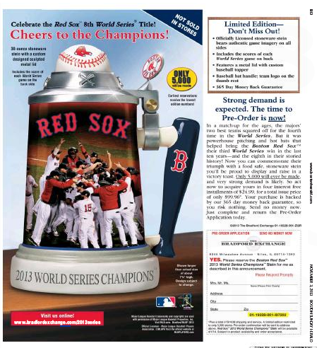 Bob’s Stores, Caseworks International (“Officially Licensed MLB Tall Mirror Back Baseball Display and the Rawlings Official World Series Baseball”), Bradford Exchange (truly awful 30-ounce stoneware stein), Boston Globe (two ads for books ‘n’ collectibles), Dick’s Sporting Goods, Macy’s