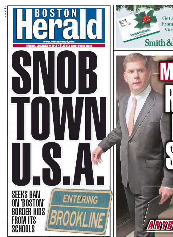 If you own a condo or home or rent an apartment that straddles the Brookline/Boston line — sorry, the Kumbayas are out the window. It’s get outta town and don’t try sending your kids to our schools.