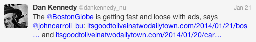 Now, we’re under no illusion that the Globeniks pay any heed to the hardreading staff. But they would pay attention to the redoubtable Dan Kennedy of Northeastern University and Media Nation, who tweeted this on Tuesday: