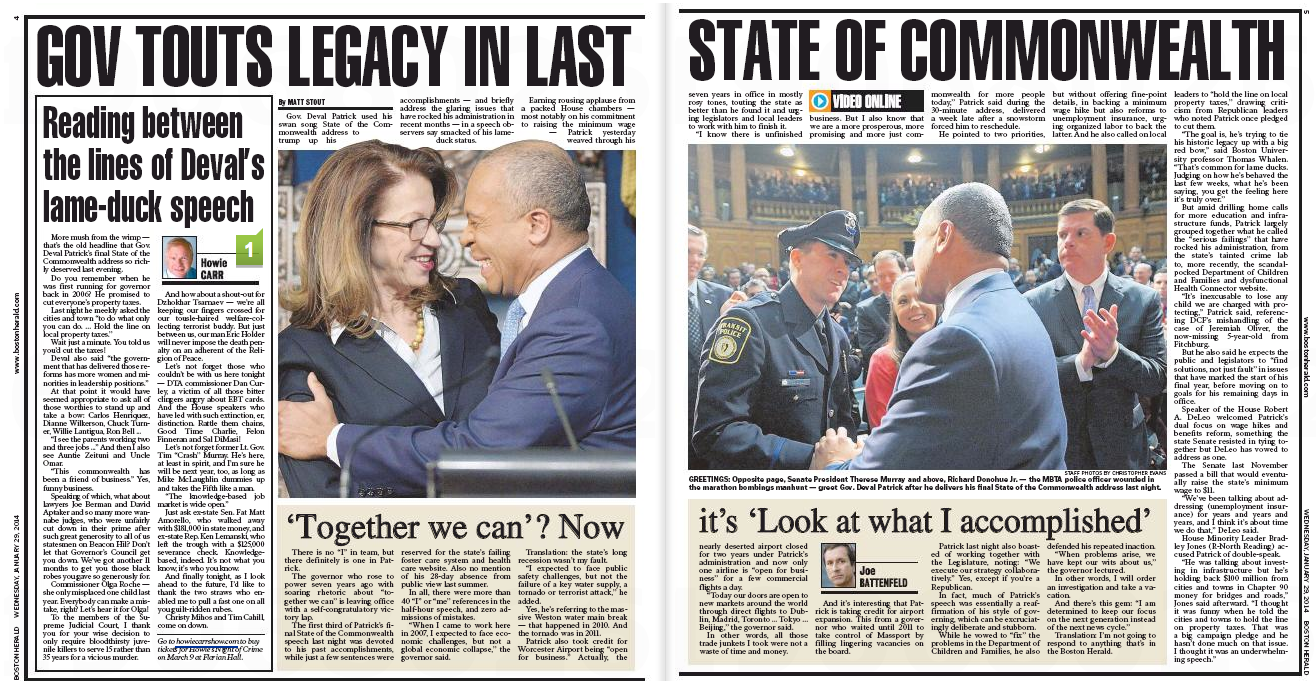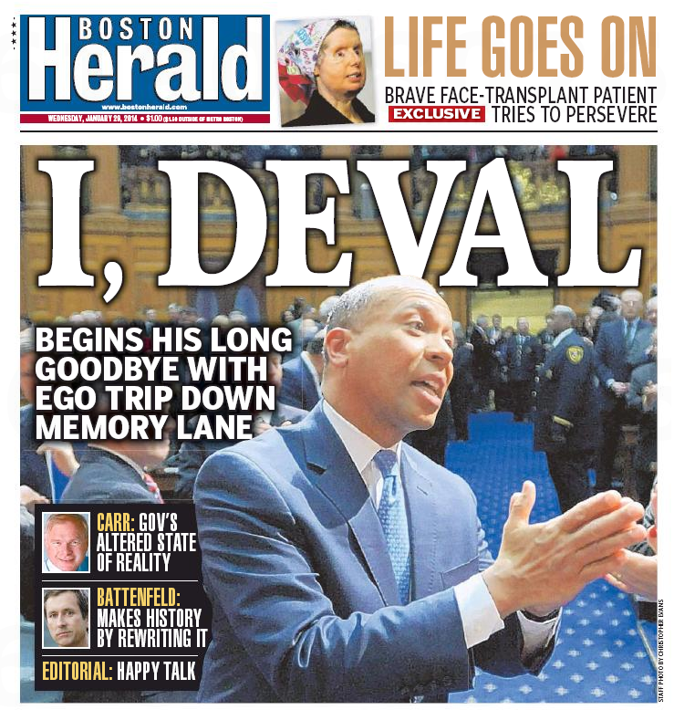 Last night Gov. Deval Patrick (D-Lame Duck Dynasty) delivered his last State of the Commonwealth speech, and today’s Boston Herald is on it like Brown on Williamson.