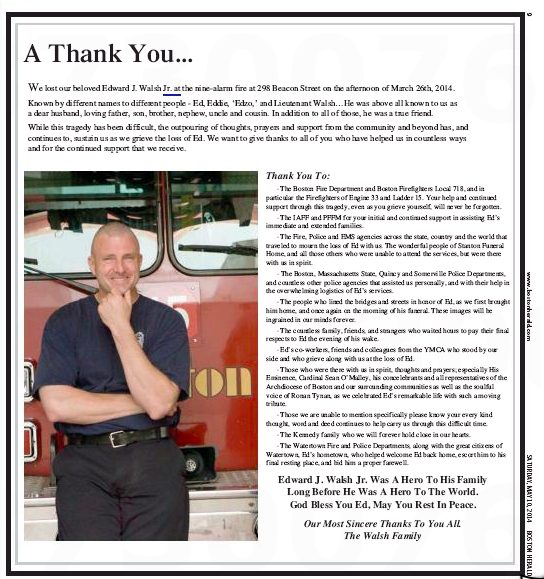 1. […] Saturday the hardreading staff noted the Boston Herald ad the Walsh family ran saluting Edward J. Walsh Jr., the Boston Fire Department […]