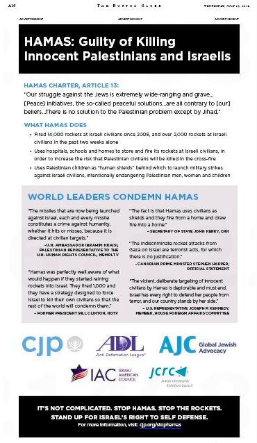 The thirsty local tabloid did, however, get a consolation prize – this ad from an alphabet-soup coalition attacking Hamas.