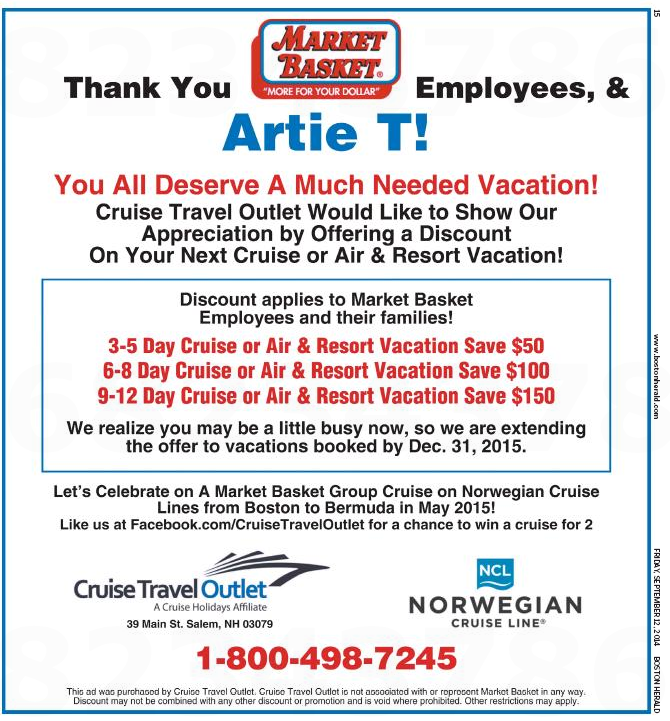 (Note the fine print: “Cruise Travel Outlet is not associated with or represent Market Basket in any way.” No surprise there, outside maybe of the tortured grammar.)