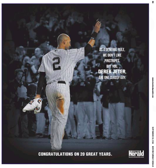 The hardreading staff was cruising through the Boston Globe Sports section this morning and amid the final final farewells to the irreplaceable Number Two, Derek Jeter, Number Two (but not at Fenway Park), we came across this full-page ad.