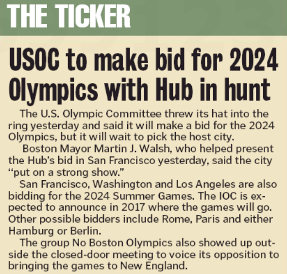 Boston mayor Marty Walsh added that “it shows you that this puts Boston on a stage. Whether or not we get the Olympics, to be able to be in the same conversation with other cities around I think says an awful lot about the strength of the city of Boston.”