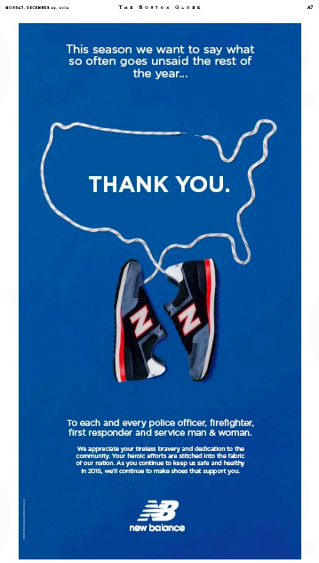 Local shoemaker New Balance yesterday saluted “each and every police officer, firefighter, first responder and service man & woman” in this full-page ad that ran in both – say it again, both – Boston dailies.