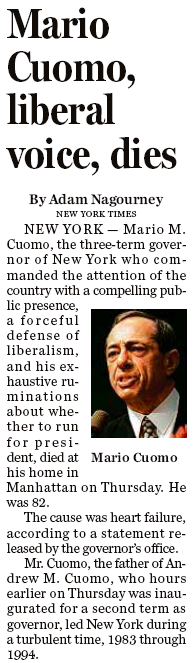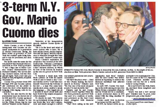 Maybe that’s why the local dailies didn’t bother to compose their own obituaries of the former New York governor, but cherry-picked them from other news outlets.