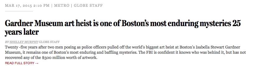 Unless the hardreading staff’s memory fails us, the Boston Herald (especially Tom Mashberg) did yeoman’s work in the wake of the Great Isabella Stewart Gardner Museum Robbery in 1990.