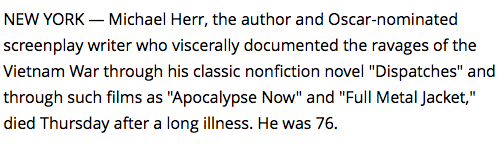 AP Corrects Michael Herr Obit; Boston Globe Doesn’t » Screen Shot 2016-06-26 at 1.38.22 PM