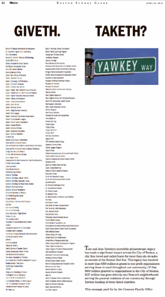 On the left are all the charities given donations by the Yawkey Foundation. At lower right is this body copy.