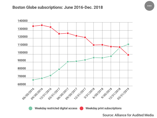 For every lost print subscriber and gained digital subscriber, the Boston Globe loses roughly $400 per annum. Not to mention, according the the BBJ report, the Globe this past year lost 10,000 print subscribers and gained 5,000 digital ones.