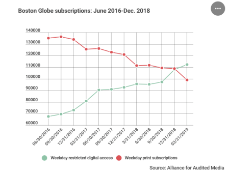 The Boston Globe reached a milestone earlier this year when the number of its digital subscribers surpassed that of its weekday print subscribers for the first time — likely the only traditional, regional daily in the U.S. to have done so.
