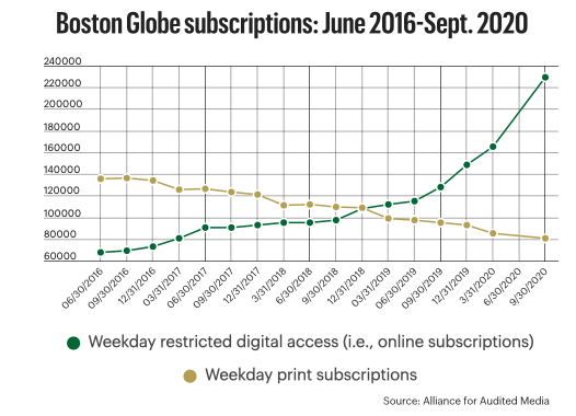 Meanwhile, the redoubtable Dan Kennedy at Media Nation provided this update on the Globe’s Fall 2020 circulation numbers, which included roughly 220,000 digital-only subscribers.