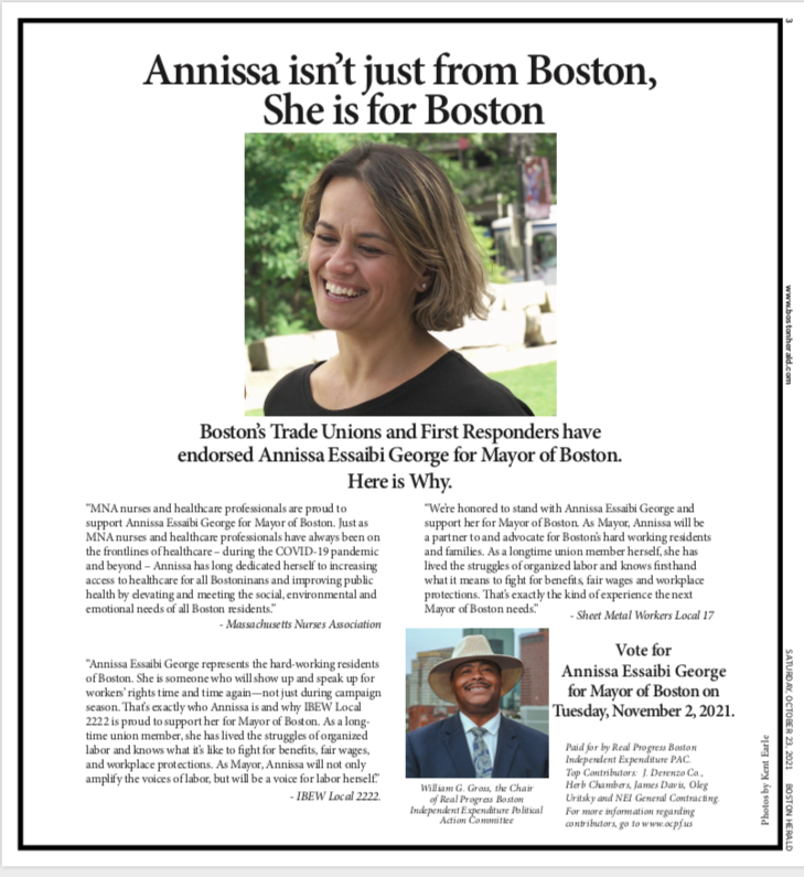 The body copy features endorsements from the Massachusetts Nurses Association, IBEW Local 2222, and Sheet Metal Workers Local 17. Sharp-eyed readers will also note the presence of former Boston Police Commissioner William G. Gross, who is listed as the Chair of Real Progress Boston Independent Expenditure Political Action Committee.