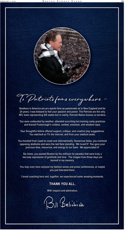 Former football coach Bill Belichick got lots of press coverage today for running this full-page ad on A3 of the Boston Sunday Globe.