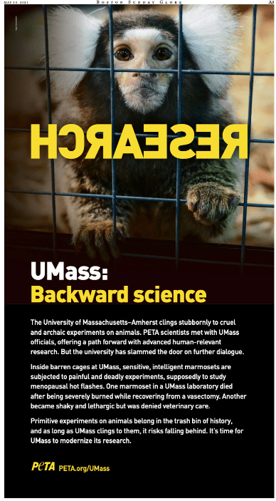 The professional provocateurs at People for the Ethical Treatment of Animals took out a full-page ad in yesterday’s Boston Sunday Globe accusing researchers at UMass-Amherst of animal abuse.