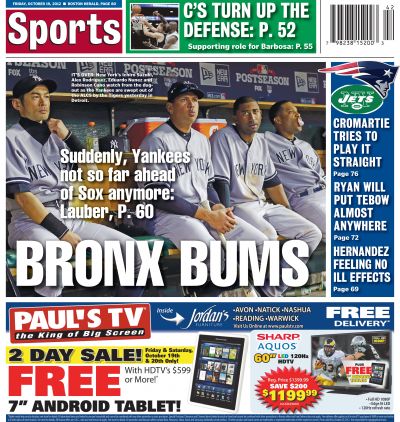 Us too. But the Tigers did, much to the delight of the Boston Herald, which devotes its back page to the the Pinstrikes’ plunge.