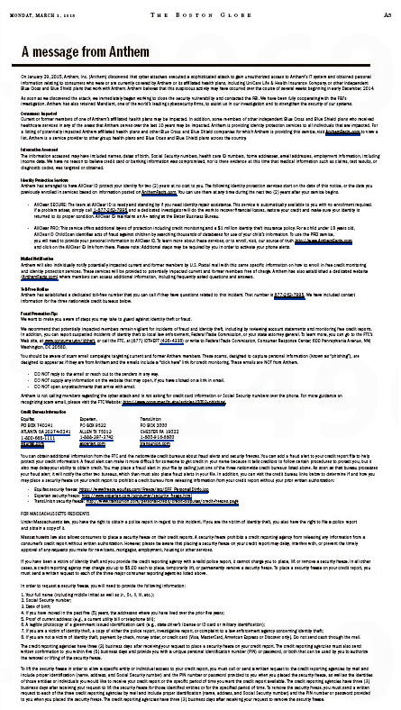 (The latter is about Anthem being hacked a month ago and forking over such data as Social Security numbers, dates of birth, income information, etc. The usual drill.)