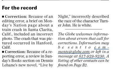 Lehane’s pretty lathered up about this, calling the correction a “pseudo retraction” and  telling the Track “For (Globe editor) Marty Baron, (book editor) Nicole Lamy or the reviewer to then not have the simple decency to contact me and say, ‘Sorry we implied you were a racist, Dennis,’ shows a serious lack of class on their part.”