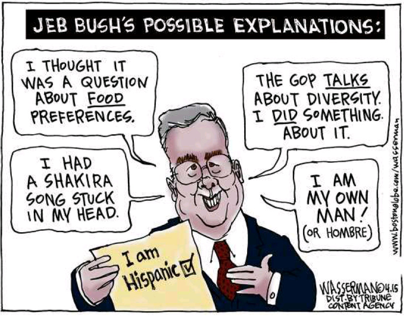 You splendid readers are no doubt aware of the current rumpus about Jeb “There’s No I in Hispanic” Bush’s identifying himself as “Hispanic” in his 2009 voter registration. That’s normally mother’s milk for the frothy local tabloid, but not in this case. Instead, Jaclyn Cashman defends the next in line of succession at the House of Bush – and takes a whack at Elizabeth Warren in the process.