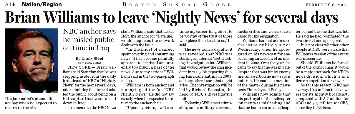 At this point, it’s really Cryin’ Brian Williams, as the NBC anchor gets pummeled from all sides for fabricating a harrowing tale of danger during hisIraq war coverage in 2003. Typical of today’s coverage is this New York Times Wire Service pickup in the Boston Sunday Globe.