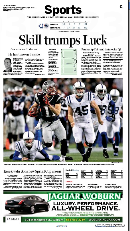 The newly minted girlfriend of New England Patriot tight (usually) end Rob Gronkowski hit the highly coveted dailies double today: Inside Track in the Boston Herald, Names in the Boston Globe.