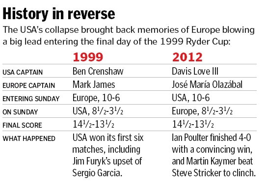Turning the tables on a day from 13 years ago that still stings, Europe staged the greatest comeback — or benefited from the biggest collapse, depending on your perspective — in Ryder Cup history, pulling off a victory just as improbable as the one grabbed by the United States at The Country Club in 1999.