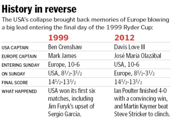 Here’s how Monday’s Boston Globe reported the throat-grabbing collapse of America’s Ryder Cup team on Sunday, after it had built a supposedly insurmountable 8 1/2 – 3 1/2 lead over the European squad.