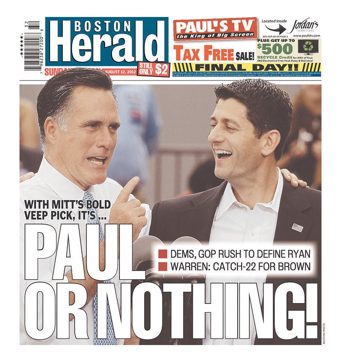 After Mitt Romney (R-How You Like Me Now?) announced his choice of running mate Saturday morning, the Paul Ryan Express roared through the news media, very much including Boston’s dailies.